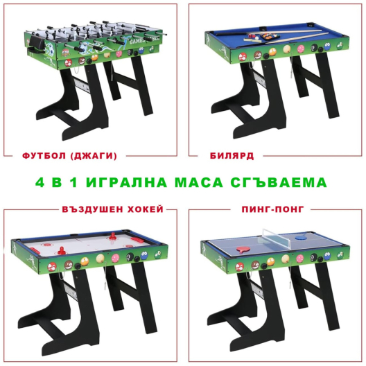 4 в 1 сгъваема игрална маса - футбол (джаги), билярд, пинг-понг, въздушен хокей - модел 2