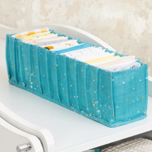 Органайзерът има компактни размери от 41x11x12 см., което го прави идеален за използване в различни пространства в детската стая. Можете да го поставите до кошарата, полица или долен рафт на шкаф, без да заема много място. Това е особено полезно за малките стаи или кътчета, където е важно да се използва пространството ефективно.