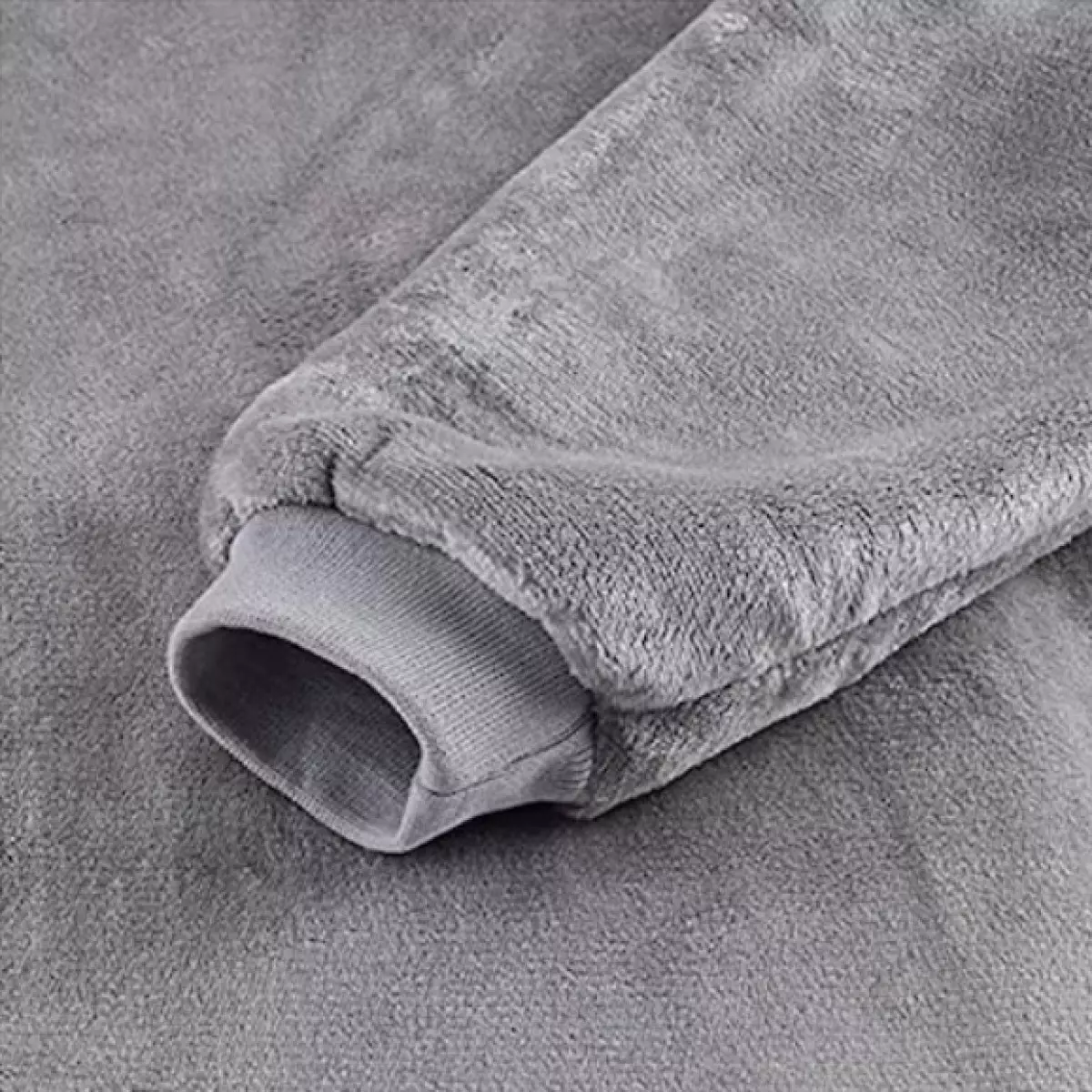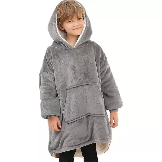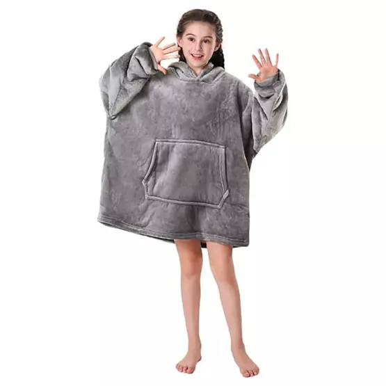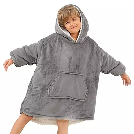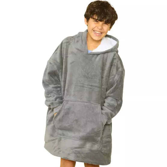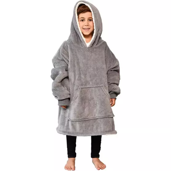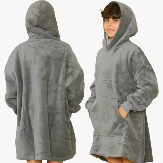 Супер меко, топло и забавно! Това детско одеяло-суичър комбинира уюта на одеяло с удобството на суичър с ръкави и качулка. Изработено от пухкава материя, то е идеално за игра у дома, гледане на филм или почивка в студените дни. Универсалният сив цвят го прави подходящо както за момичета, така и за момчета.