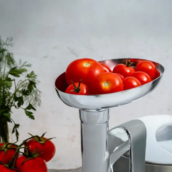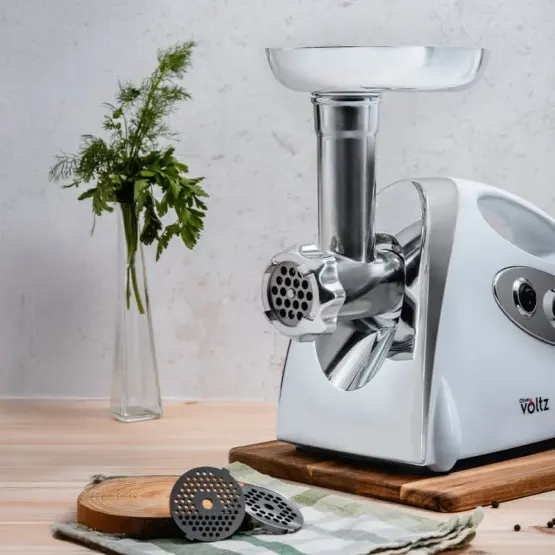 Месомелачка с приставка за домати Voltz V51991A, 1400W, Обратен ход, Аксесоари за сосове и Kubbe, Бял