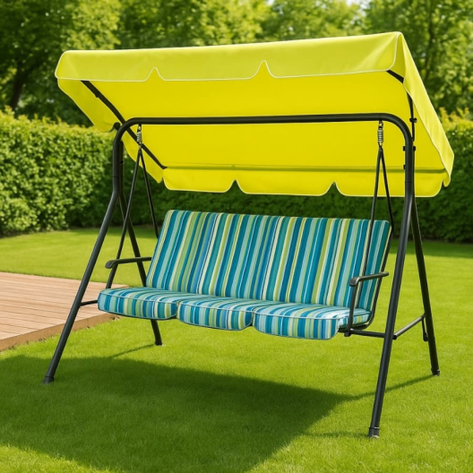 Насладете се на моменти на удоволствие и релакс във Вашата градина или балкон с нашата триместна градинската люлка. Тази многоцветна градинска люлка със сенник красиво ще украси Вашето пространство.