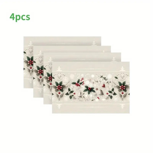 Съчетайте практичност и елегантност с комплекта от 4 броя коледни подложки за маса в дизайн „Цветя и звънчета“! Тези подложки са създадени, за да донесат свежест и красота на вашата маса, като в същото време я предпазват от ежедневни следи и петна. Подходящи както за празнични събирания, така и за ежедневна употреба, тези подложки ще направят всеки повод специален.