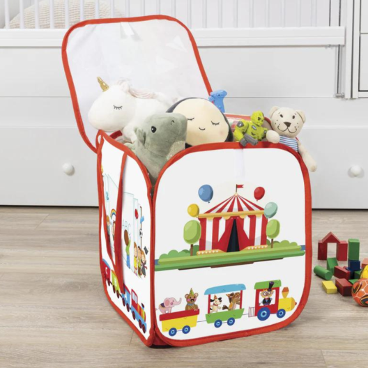Дизайнът на коша е семпъл, но много ефективен. Той разполага със здрава конструкция и е подходящ за разнообразие от играчки - от плюшени животни и кукли до строителни блокчета.