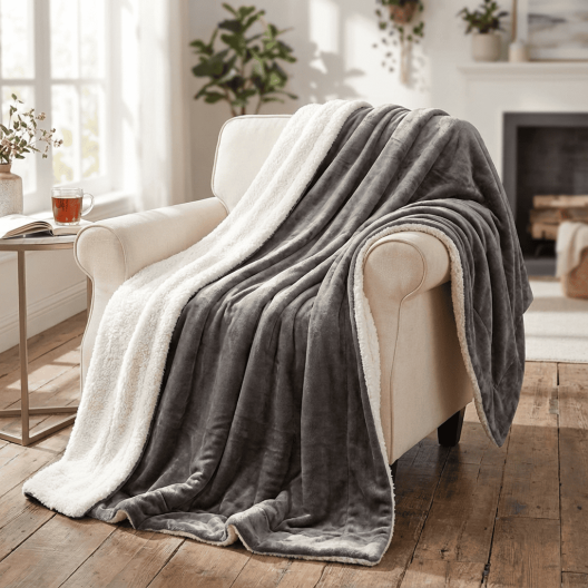 Двулицевото пухкаво одеяло с горна част от полар и плюшен гръб от шерпа ви носи изключителна мекота и топлина, предлага ви различни сетива, подобрява съня ви със своята гладка и пухкава страна. Перфектно като декоративен акцент или уютна обвивка за леглото.