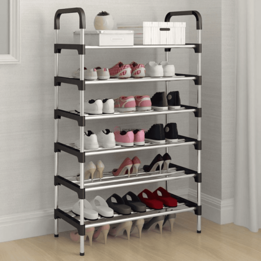 Практичен и издръжлив органайзер, изработен от здрава метална конструкция с 6 рафта за подреждане на обувки, кутии или аксесоари. Осигурява удобство и ред във входното антре, гардероба или килера, като същевременно заема малко място.