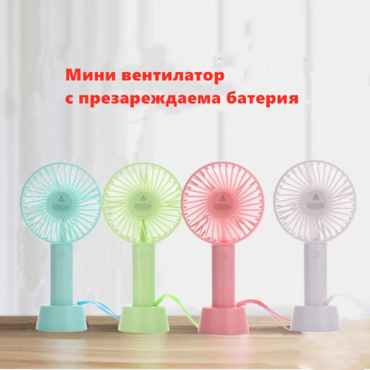 Мини вентилатор с три степени на мощност, подходящ за офиса, дома и за разходка/излети. С компактните си размери можете да го носите на всякъде с Вас. Не оставяйте малкия размер да ви заблуди, защото произведената мощност е повече от достатъчна. Зареждането на батерията(18 650mAh) става направо в гнездото на вентилатора, ползва се кабела от комплекта който директно се включва в корпуса на вентилатора (micro USB) а пък другия край се включва в USB порт на компютър, лаптоп или преносима батерия.