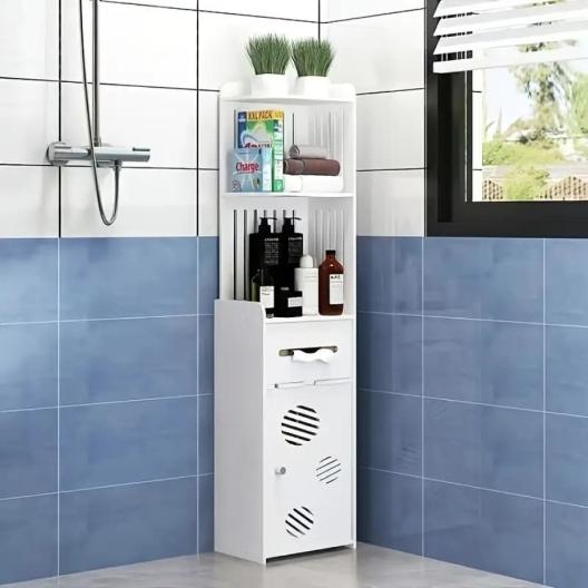Практичен и удобен ъглов шкаф с пет нива, който осигурява максимално оползотворяване на пространството във вашата баня. Изработен от влагоустойчиви материали, той предлага достатъчно място за съхранение на козметика, почистващи препарати и аксесоари.