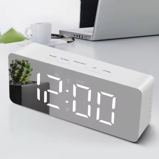 Часовникът е оборудван с голям и ясен LCD дисплей, който показва реално време, дата и температура. Със своите бели светодиоди, дисплеят е ясно видим и не дразни окото, дори и през нощта.