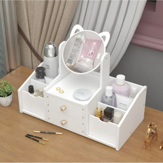 - Дървената тоалетка е чудесен рафт за съхранение на козметика, като червило, очна линия, гланц за устни, моливи за вежди и друга козметика и бижута