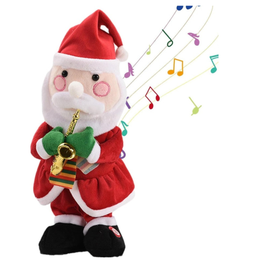 Когато натиснете бутона, Дядо Коледа започва да свири оживена музика, придружена от танци и изпълнение на саксофон. Той дори ще повтаря думите, които чуе.