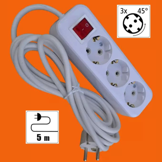 Разклонител 3 гнезда с кабел 5 м и прекъсвач - бял