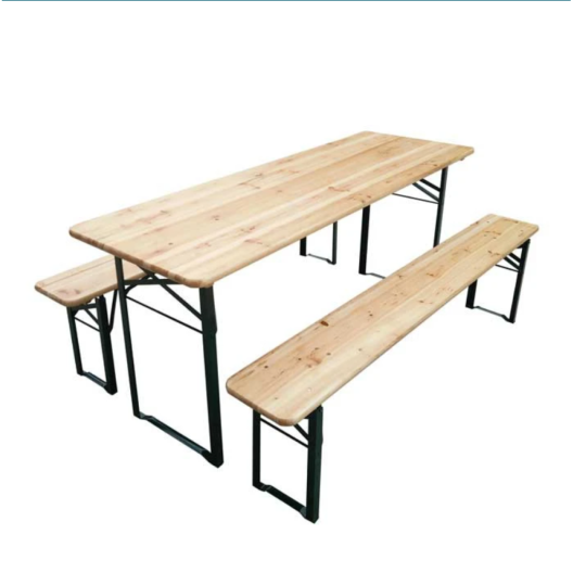 Сгъваемият бирен сет е практично и функционално решение за всякакъв вид събирания на открито или закрито. Комплектът включва една маса с размери 180х60х70 см и две пейки с размери 180х25х43 см, което го прави идеален за големи групи. Дървените плоскости с дебелина 28 мм осигуряват стабилност и издръжливост, като същевременно придават естествен и естетичен вид на комплекта. Рамката е изработена от метал с прахово боядисано покритие, което гарантира устойчивост на атмосферни влияния и дълготрайност. Благодарение на сгъваемия дизайн, биреният сет е лесен за съхранение и транспорт, което го прави перфектен избор за семейни тържества, пикници, фестивали или други събития.