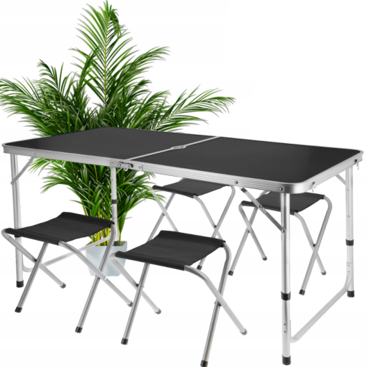 Сгъваемата къмпинг маса с 4 стола е перфектният избор за вашите приключения на открито. Снабдена с алуминиева рамка за лекота и издръжливост, тази маса е идеална за пикници, къмпинг, барбекюта и други активности навън.
