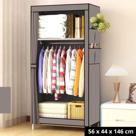 Размерите на гардероба - 56x44x146 см., са перфектни за съхранение на различни предмети, от дрехи до обувки и аксесоари. Вътрешността му е разделена на множество части, включително рафтове и странични джобове, което ви позволява да организирате вещите си точно по вашите нужди и предпочитания.