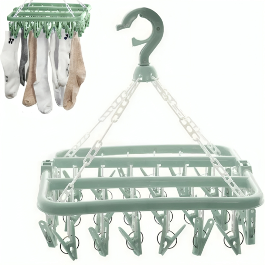 Закачалката с щипки за сушене на чорапи и бельо с 32 клипса е практично и ефективно решение за сушене на чорапи и бельо. Независимо дали се използва на балкони, тераси, у дома или в градината, този сушилник е идеален за всекидневните нужди от пране.